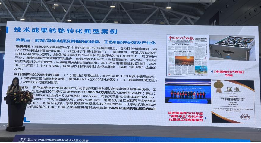 11月16日,实验室副主任李贺军带队参加了由广东省科学技术厅指导、广东省科技基础条件平台中心和广东省科技金融促进会在高交会现场共同主办的2025年广东省实验室重大科技成果转化对接会。对接会上,实验室作为“优秀实验室”代表,重点推介了成立以来产出的重大科技成果及近年来取得的成果转化落地成效,并与实验室孵化企业季华恒一(佛山)半导体科技有限公司作为代表性成果转化项目上台签约,吸引多家参会金融机构和企业代表洽谈交流。