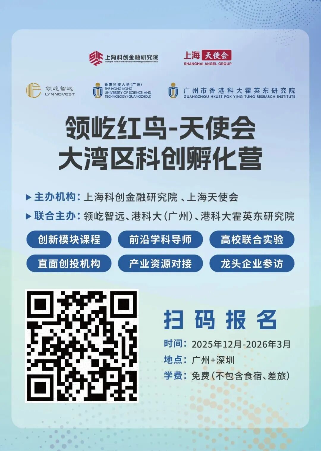 经过为期数月的精心筹备,由领屹智远、港科大(广州)、港科大霍英东研究院、上海科创金融研究院、上海天使会联合主办,针对早期科技创业者量身打造的深度赋能创新孵化计划——“2025 领屹智远大湾区科创孵化营”招募活动正式启动,扬帆起航!