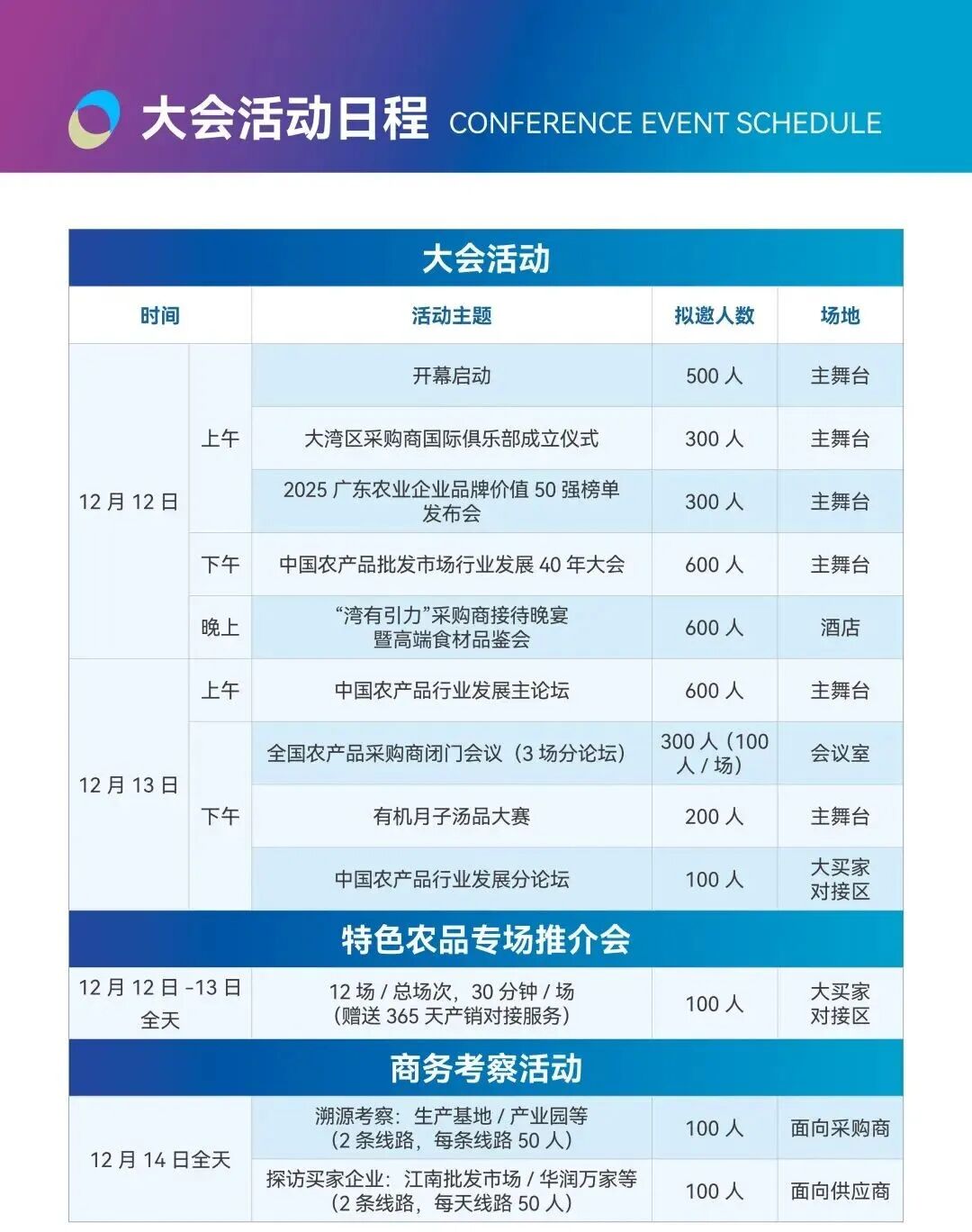 作为全国首个专注B2B交易的农业专业展会,首创“媒体+”战略,通过全媒体矩阵实现亿级传播曝光,并依托超6700万媒体用户资源精准链接产销。展会汇聚超10000名海内外专业采购商,涵盖出口贸易商、高端餐饮、电商平台等多元渠道,聚焦农产品与土特产交易,致力打造“展示‑对接‑成交”一体化的高效农业贸易平台。