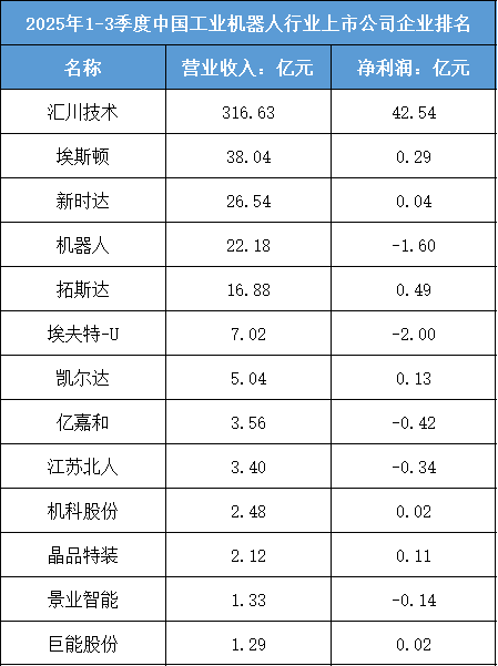 根据东财行业分类,2025年1-3季度中国工业机器人行业上市公司企业排名如下:(A股上市公司)