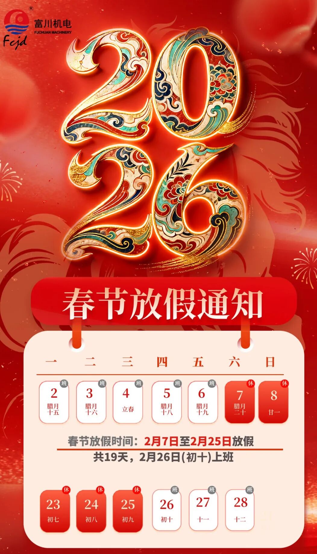 值此 2026 丙午马年新春佳节,富川机电全体富川人衷心感谢每一位客户、合作伙伴和朋友们的支持与信任!恭祝您新春快乐,阖家幸福,万事顺意,马到功成!