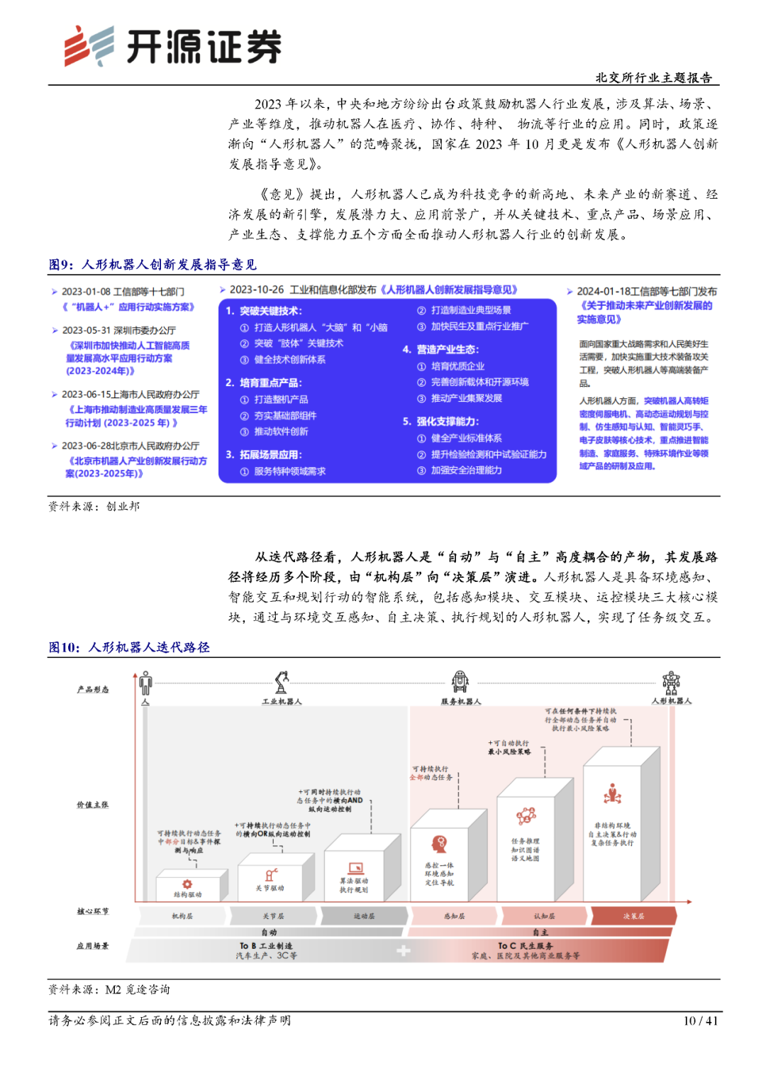 2023年以来,中央和地方纷纷出台政策鼓励机器人行业发展,涉及算法、场景、产业等维度,推动机器人在医疗、协作、特种、物流等行业的应用。同时,政策逐渐向“人形机器人”的范畴聚拢,国家在2023年10月发布了《人形机器人创新发展指导意见》。该意见提出,人形机器人已成为科技竞争的新高地、未来产业的新赛道、经济发展的新引擎,发展潜力大、应用前景广。