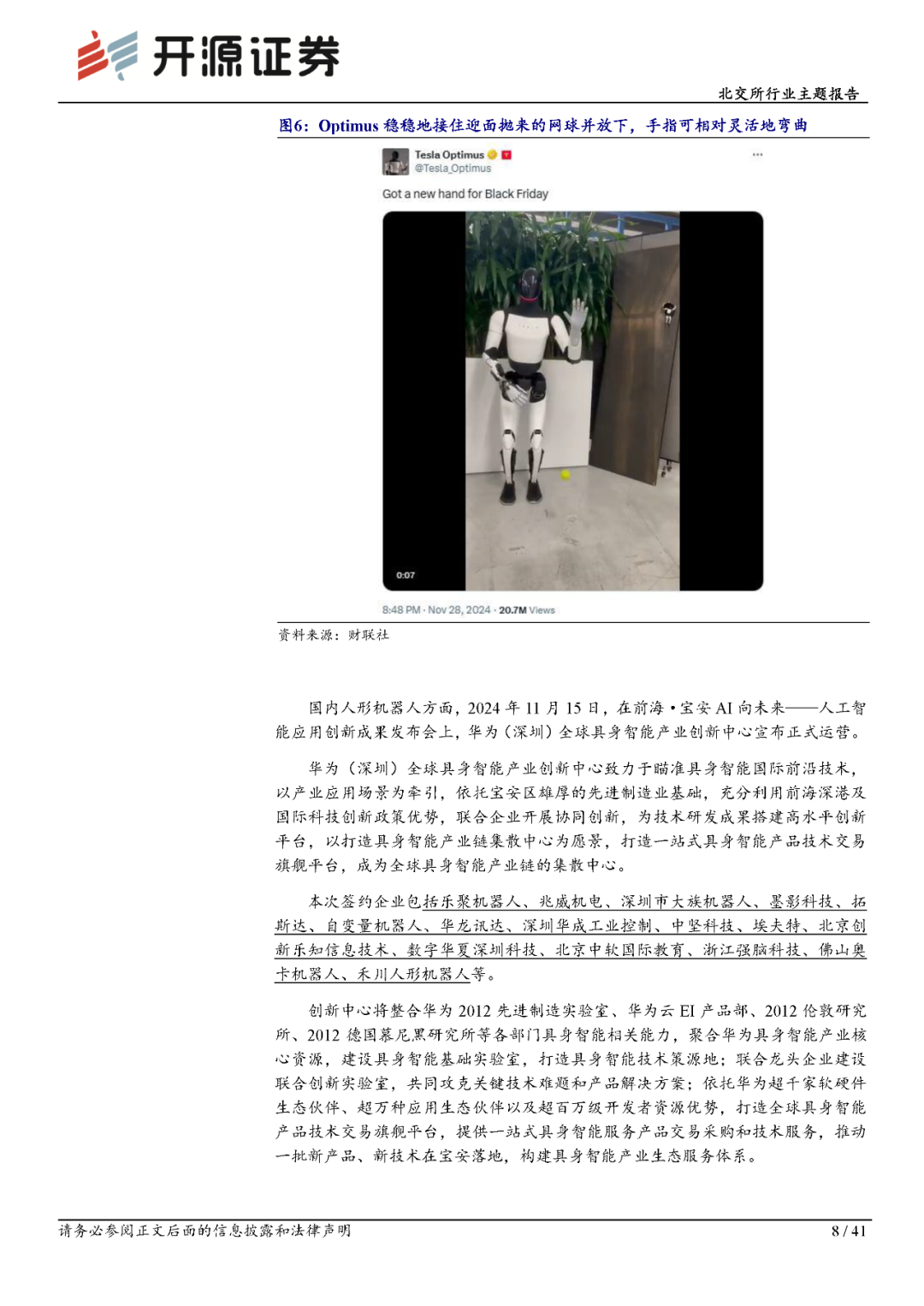 以特斯拉Optimus为例,其最新展示的灵巧手拥有22个自由度,手腕/前臂上有3个自由度,能够完成叠衬衫、在工厂分拣物品等任务。国内方面,华为(深圳)全球具身智能产业创新中心宣布正式运营,致力于瞄准具身智能国际前沿技术,以产业应用场景为牵引,推动一批新产品、新技术在宝安落地,构建具身智能产业生态服务体系。