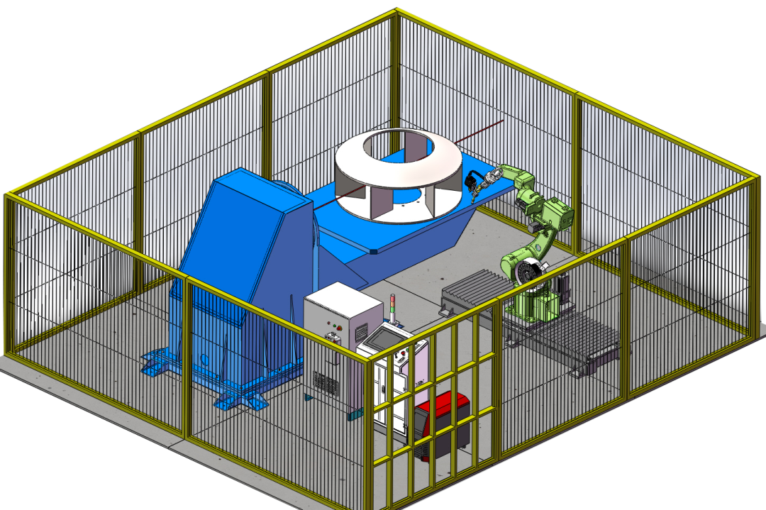 针对风机焊接识别精度可达0.1mm,传感器寻位引导使机器人及时调整焊枪位置和姿态,始终按照最合适的轨迹焊接,实现了智能化和柔性化焊接。精度高,抗干扰能力强,抗反光,算法识别稳定。