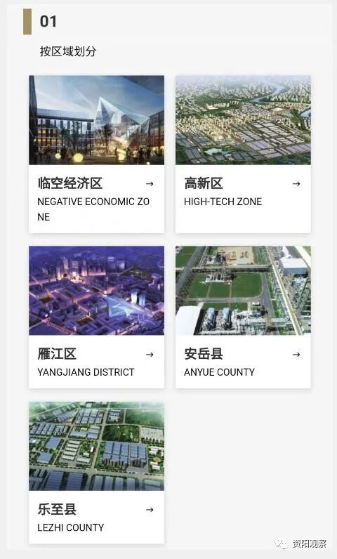 在区域划分中,按照临空经济区、高新区等县区,分区域展示全市各县区的重点推介项目,其中雁江区和安岳县还以乡镇划分,使推介项目的地点更加具体。