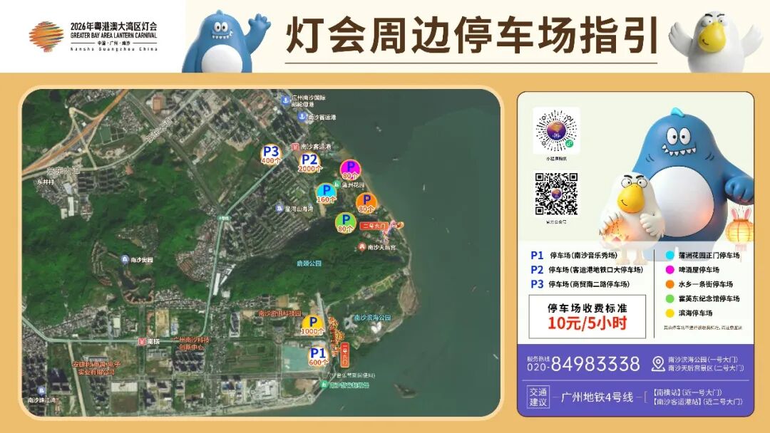 PS:滨海公园(一号门)与天后宫(二号门)周边设置有多个停车场(非官方),自驾前往的游客可按进场需求导航至对应停车场,停车后步行进入灯会参观游览。部分停车场位于交通管控区域内,请注意入场时间。