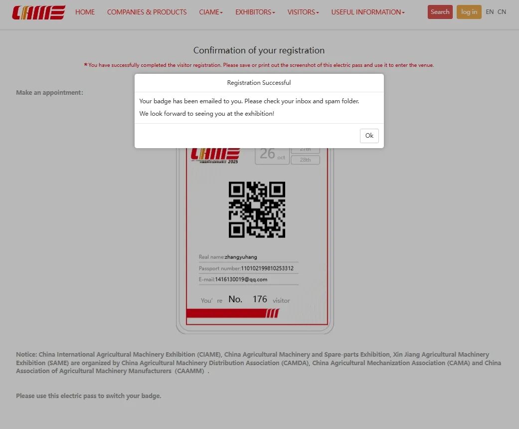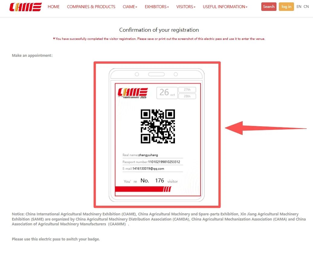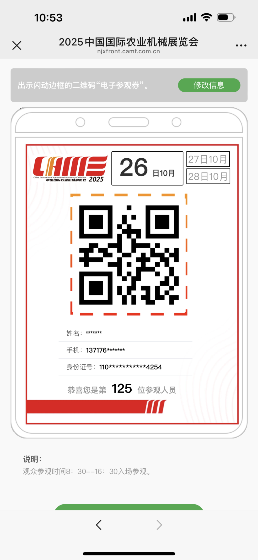 注:核实信息无误可现场出示该二维码进行参观,如参观日期(可多选)选择错误,可在本页面右上角“修改信息”处更改。