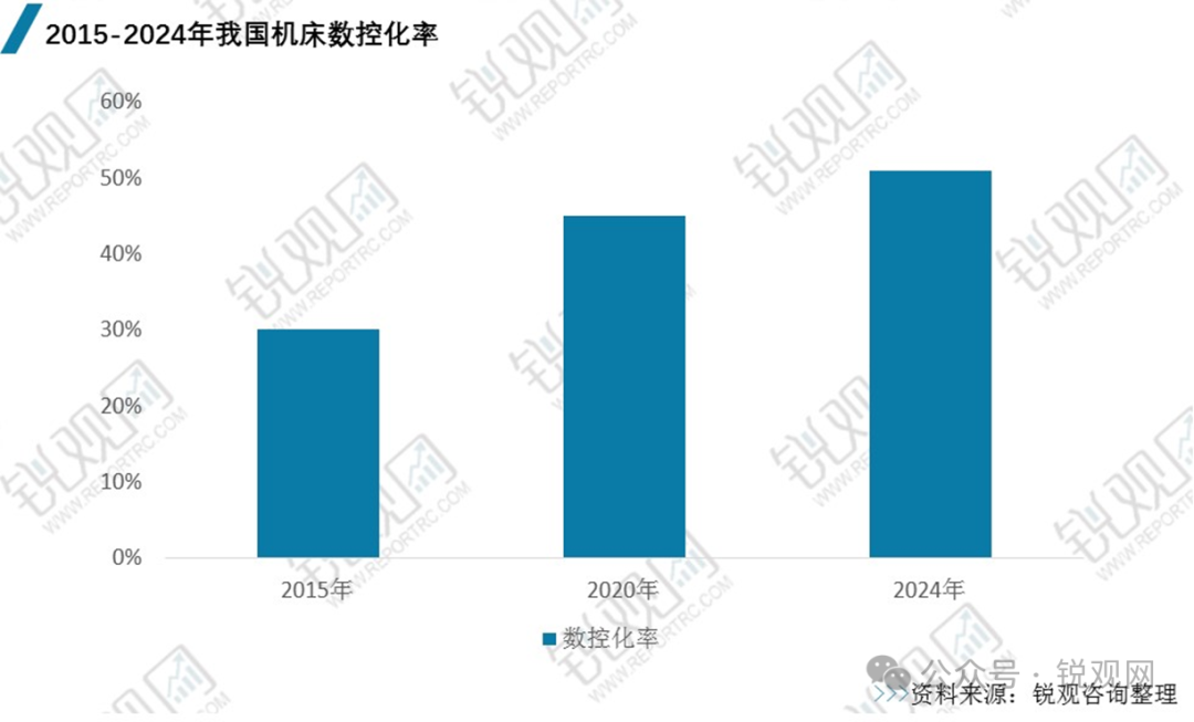 在过去的十年间,我国机床数控化率稳步提升,实现了从2015年的30%到2020年的45%,再到2024年约51%的跨越。然而,与国际先进水平相比,仍存在较大差距。日本机床数控化率常年保持在80%以上,美国和德国也均超过70%。这种差距既是挑战,也是机遇,凸显出我国机床数控化发展的巨大潜力。