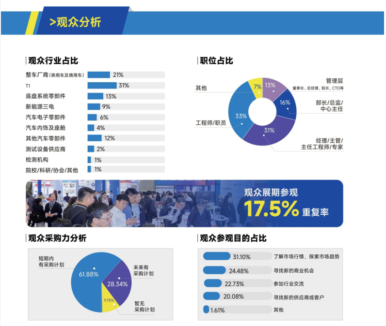 精准锁定核心观众:主机厂占比超20%、T1厂商占比超30%,61.88%观众短期内有明确采购计划,直连采购决策层,获客更高效;