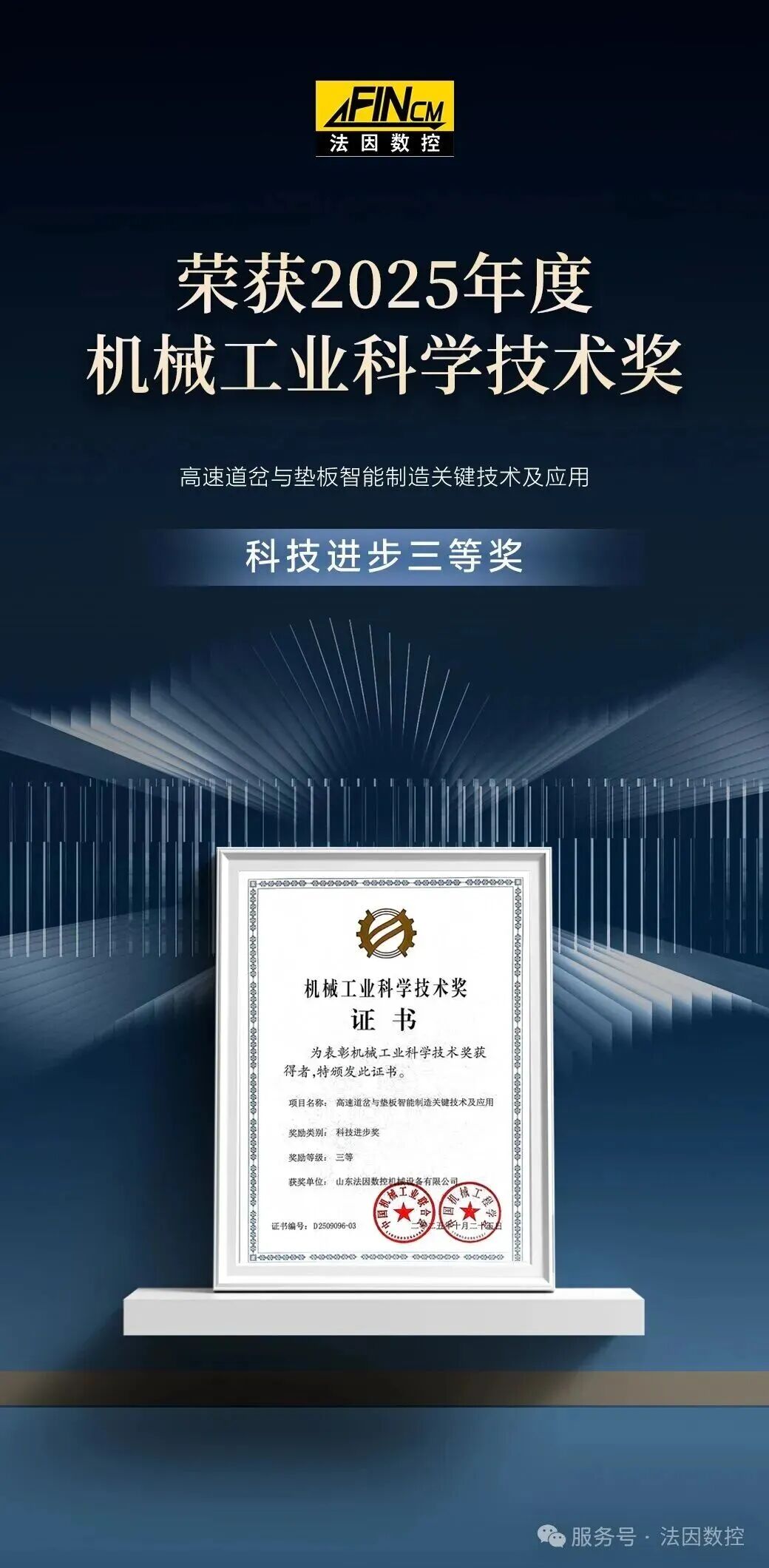 近日,2025年度中国机械工业科学技术奖获奖名单揭晓,华明电力装备股份有限公司子公司山东法因数控机械设备有限公司凭借“高速道岔与垫板智能制造关键技术及应用”项目斩获“科技进步三等奖”。这一由国家科学技术部批准设立的全国机械行业最高科技荣誉,既是对法因数控技术攻坚实力的权威认证,也标志着其在智能制造领域的创新突破获行业高度认可。