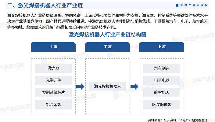 激光焊接机器人产业链层级清晰、协同紧密。上游以核心零部件和材料为支撑,激光器、控制系统等关键部件技术水平决定行业基础竞争力,国产替代进程持续推进。中游聚焦机器人本体制造与系统集成。下游覆盖汽车、电子、航空航天等多领域,终端需求的升级与场景拓展反向驱动产业链技术迭代。