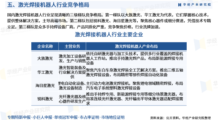 国内激光焊接机器人行业呈现清晰的三级梯队竞争格局。第一梯队以大族激光、华工激光为代表,它们掌握核心技术,提供整体解决方案,主导高端市场。第二梯队包括锐科激光、海目星激光等,聚焦核心器件或细分赛道,凭借技术专精立足。第三梯队是众多手持焊设备厂商,产品同质化严重,竞争聚焦价格,行业洗牌加速。