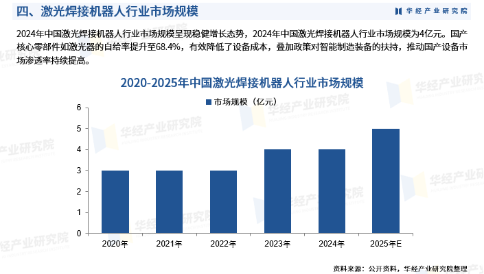 2024年中国激光焊接机器人行业市场规模呈现稳健增长态势,2024年中国激光焊接机器人行业市场规模为4亿元。国产核心零部件如激光器的自给率提升至68.4%,有效降低了设备成本,叠加政策对智能制造装备的扶持,推动国产设备市场渗透率持续提高。