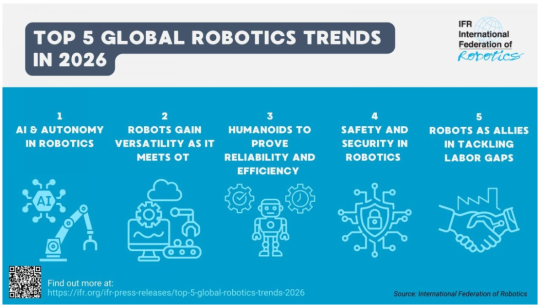 全球工业机器人市场价值已达到167亿美元的历史新高。未来的需求将受到一系列技术革新、市场力量和新兴业务领域的驱动。以下是2026年机器人行业五大发展趋势: