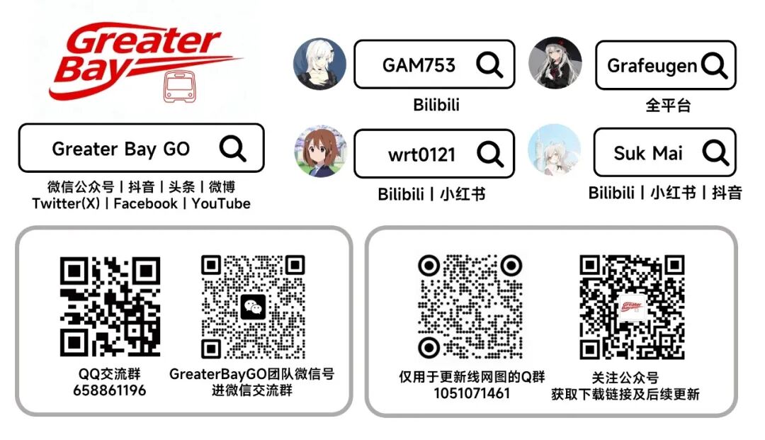 Greater Bay GO团队目前在公众号、抖音、头条、微博、推特(X)、Facebook均有账号,团队幕前成员wrt0121在Bilibili、小红书设有账号,GAM753_在Bilibili设有账号,Suk Mai在Bilibili、小红书、抖音设有账号,Grafeugen在全平台设有账号,欢迎关注。