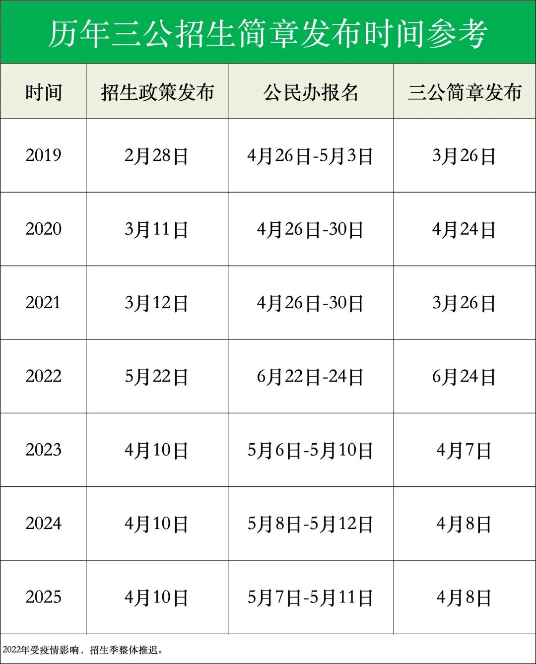 按往年来讲,三公招生简章的发布时间在公办报名前的1个月左右,家长朋友们一定要提前关注一下各学校的官网。