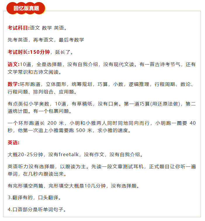 数学分3个难度梯度,6题7分钟、5题10分钟、1题8分钟,重点考查行程、几何、数论;