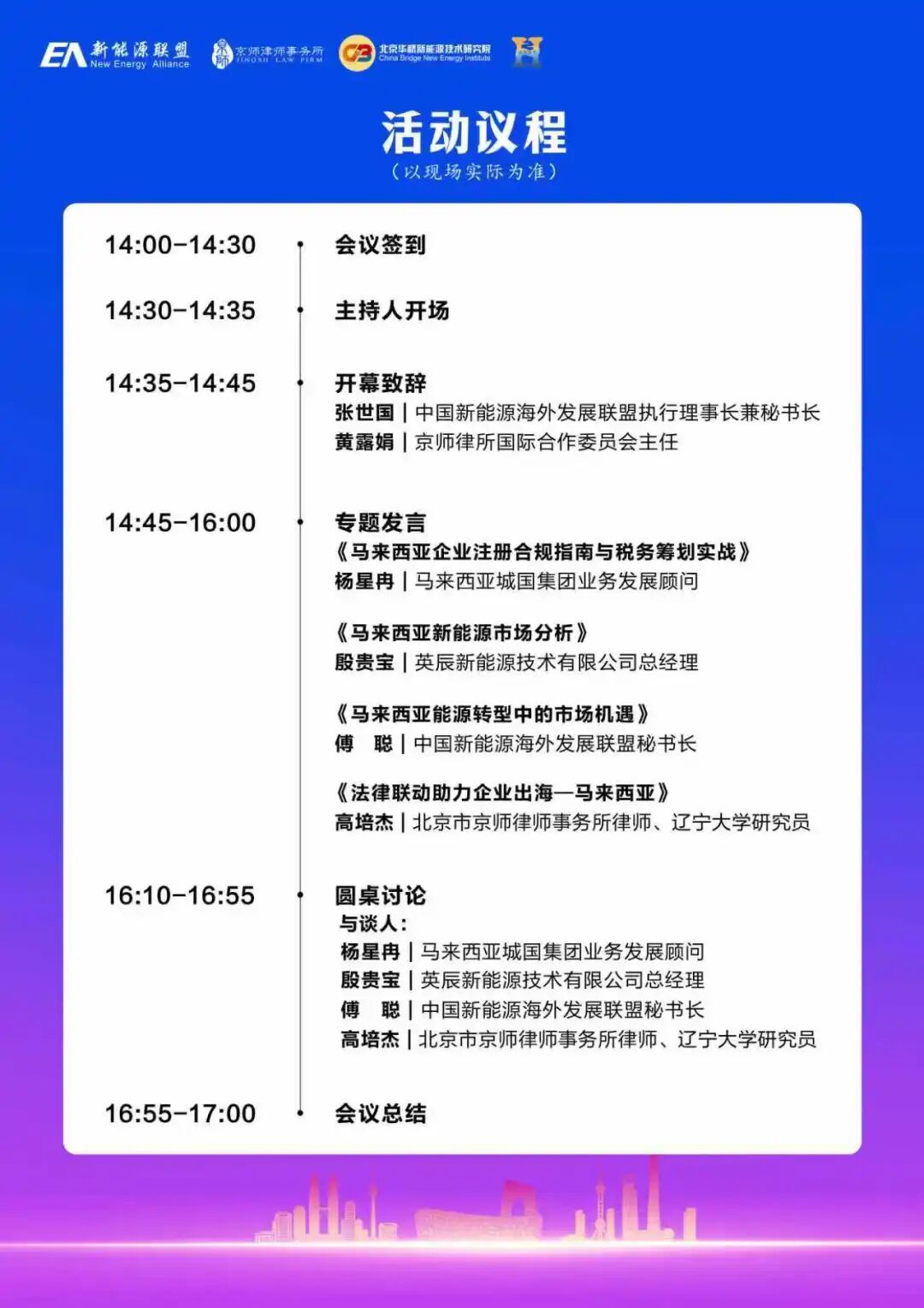 【地址】北京市朝阳区东四环中路37号京师律师大厦大讲堂【主办】中国新能源海外发展联盟、北京市京师律师事务所【主持】张世国,新能源海外发展联盟执行理事长兼秘书长 【报名】请在关注本公众号后,在后台报名(姓名、单位、职务) 往期回顾↓