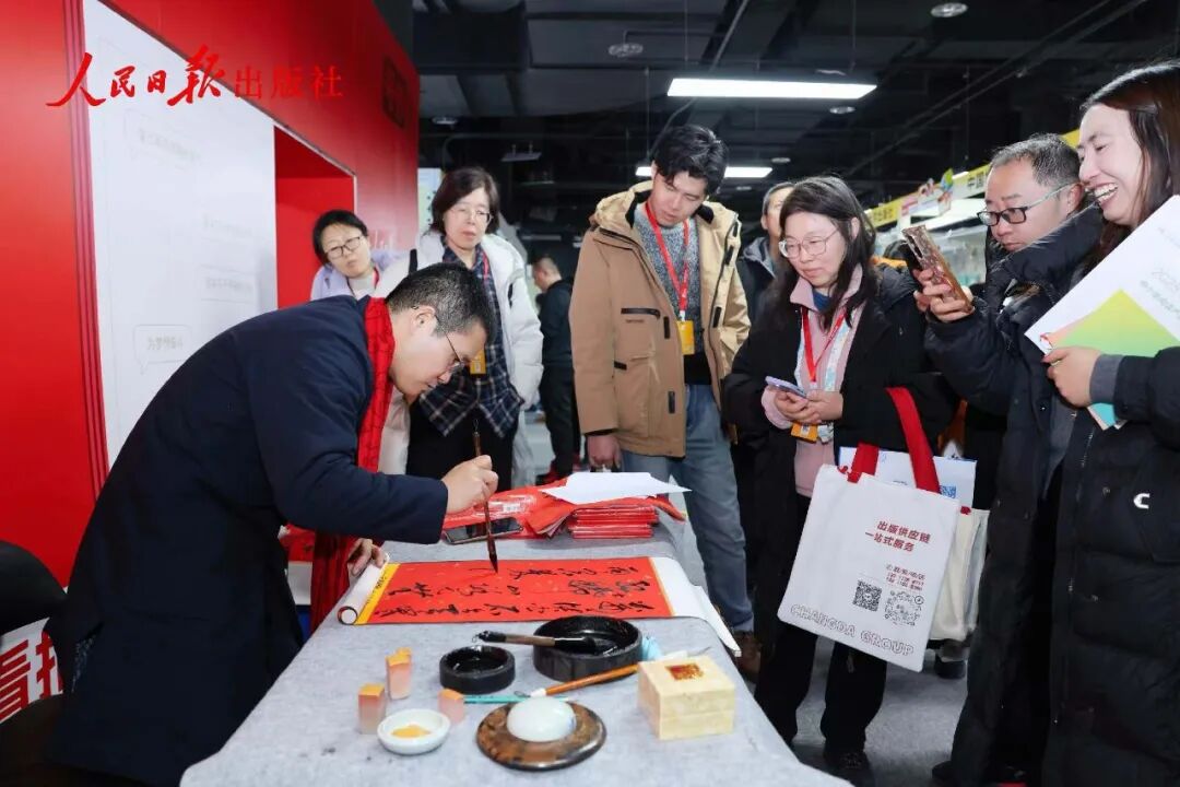 各大参展单位纷纷亮出“看家本领”,文创产品覆盖生活、学习、收藏等多个场景,展现出版文创的多元可能性:将课本IP玩出新花样,“鲁迅”主题盲盒自带情怀滤镜,每一款都还原课本经典场景;更打造“人教咖啡”休闲区,逛展间隙可品味书香与咖啡香的碰撞,现场还有趣味抓娃娃机,带来轻松逛展体验;五三图书突破教辅品牌边界,推出“一品五三”定制酒,实现“图书+酒”的跨界创新,为出版文创跨界提供新范本;更有法治文创推出主题帆布包,将法律知识融入时尚设计,让法治文化以更轻盈的方式走进日常生活;还有大家熟悉的意林杂志,带来经典杂志IP周边,笔记本、书签、文创礼盒等产品延续刊物的人文情怀,成为文艺爱好者的必入单品;新年将至,展区最具新年氛围的打卡点莫过于人民日报出版社。人民日报出版社编辑、知名书法家万方正(艺名萧逸)亲临现场题写对联。现场观众可获得专属定制对联,在笔墨书香中感受传统文化的魅力,为逛展留下独特的文化记忆。万方正先生讲:“艺术只有回到人民中间为人民服务才能获得蓬勃生命力!”资源聚合:让文化创意落地产业实效
