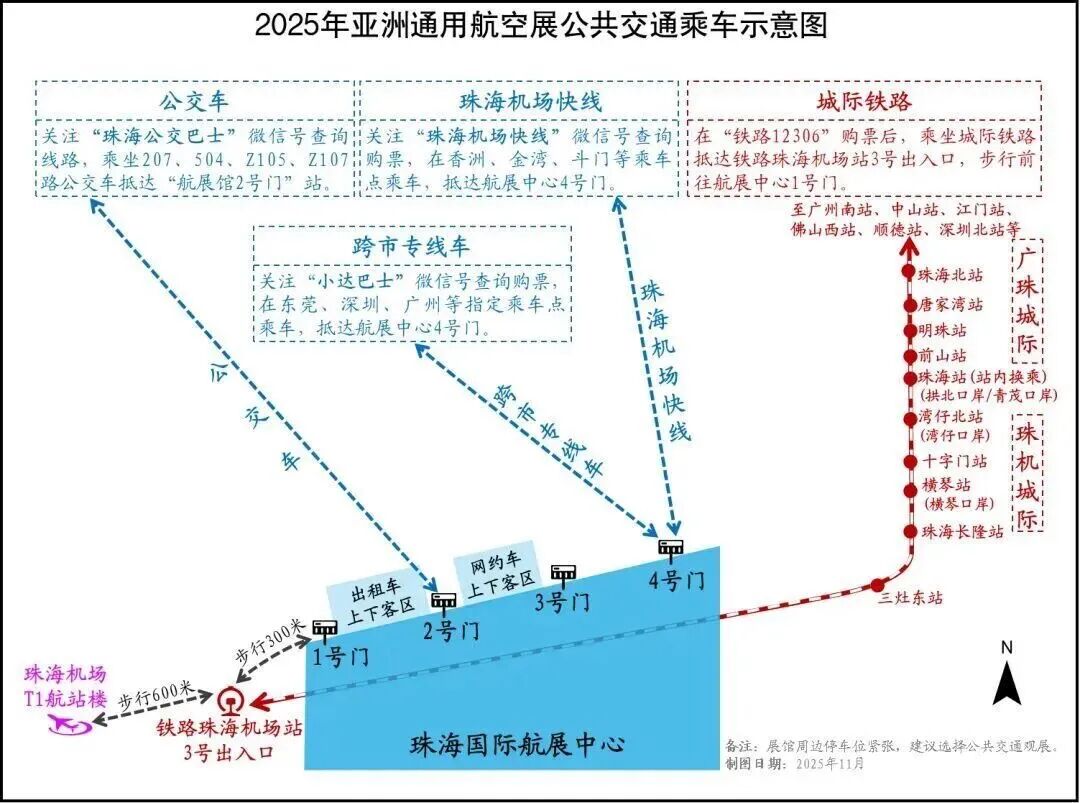 2025年亚洲通用航空展11月27日-30日在珠海国际航展中心举办,日接待量1.5万人,展馆周边停车位紧张,优先选公共交通更省心~✅ 广州:关注“小达巴士”购票,7:00-7:45从南航明珠商务酒店、杨箕地铁站A口等4个站点发车,直达航展中心4号门,返程按原路线返回;✅ 深圳/东莞:每日1班专线,覆盖大剧院、车公庙、东城地铁站等站点,提前购票锁定座位。1. 广珠城际:广州南站出发,到珠海站后从B出口换乘珠机城际至“珠海机场站”,3号口出站步行300米到航展1号门;2. 提前在“铁路12306”买往返票,团体旅客可享快速安检和优先进站通道,咨询电话020-61373504。• 机场快线:微信搜“珠海机场快线”购票,市内拱北、香洲、横琴等区域及中山、江门、澳门均有站点,直达航展4号门;• 公交车:乘207、504、Z105、Z107路到“航展馆2号门”站,关注“珠海公交巴士”查实时路线;• 出租/网约车:分别在1-2号门、2-3号门设临时上下客通道,快速接驳。仅有珠海机场交通中心(1500泊位)和珠海太空中心(500泊位,支持无障碍预约)2个停车场,未预约请果断选公共交通,停车费以现场为准。入住指定接待酒店(如横琴星乐度、希尔顿花园酒店等)的展商/嘉宾,可凭展会证件提前1天19:30前在酒店大堂预约,免费往返航展4号门。来源:羊城晚报金羊网、广州日报新花城;如有侵权请联系本公众号。