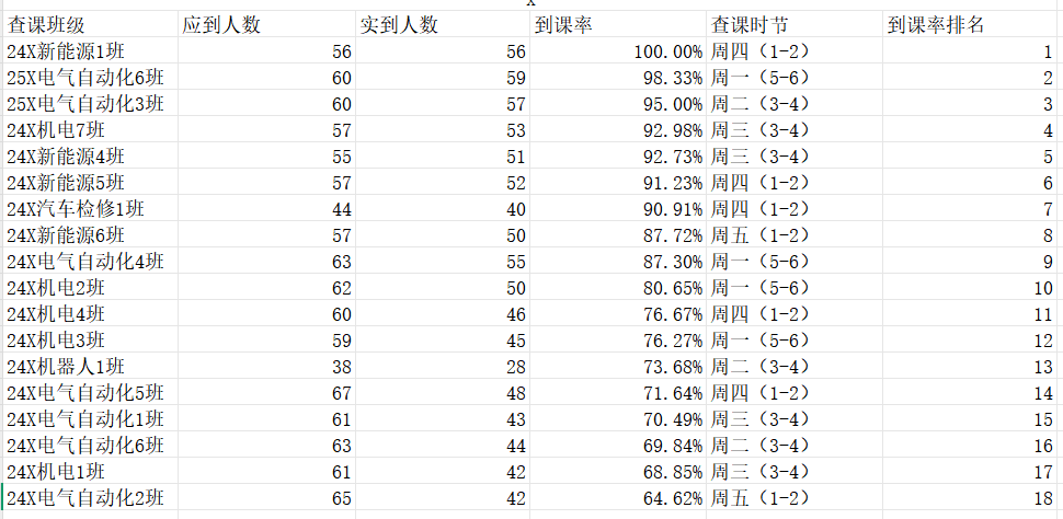学风建设智能制造与汽车学院 智能制造与汽车学院团委工作人员对智能制造与汽车学院(江门校区)第九周的学生课堂情况和学生到课率进行了统计。第九周查课汇总第九周的查课汇总到这里就结束啦,辛苦各位查课的工作人员,也感谢各班班委的支持和配合,望各位同学按时上课,认真学好每一堂课。END【往期回顾】供稿:团委办公室排版:刘海潮初审:王子君老师复审:温瑞瑜老师终审:姚柏洲老师