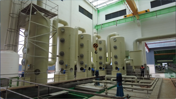 整个酸洗过程在密闭环境中进行,控制酸雾的外溢,改善车间环境及工人的操作条件,并对收集的酸雾多级吸收净化后再排放,酸槽及冲洗场地周围全部做多层防腐处理,有效控制废酸、废水滴漏向地下层渗透的风险,可第一时间发现“跑冒滴漏”现象,并及时做出处理。酸液自流排空,有效节约能源、提高空间利用率;酸洗槽设置循环泵,通过泵强制循环,提高反应速率。