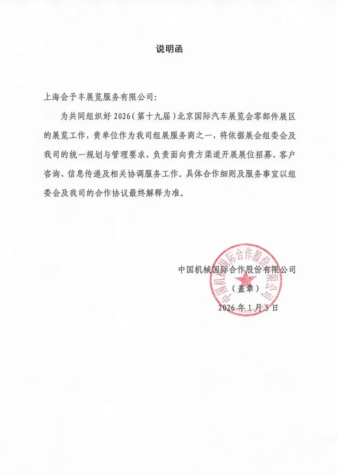 2026年1月5日,上海会予丰展览服务有限公司正式获得中机国际授权代理,进行2026年北京车展招展及相关协调咨询服务。我们将竭力为意向企业提供全方位服务,帮助企业轻松、高效地参展。