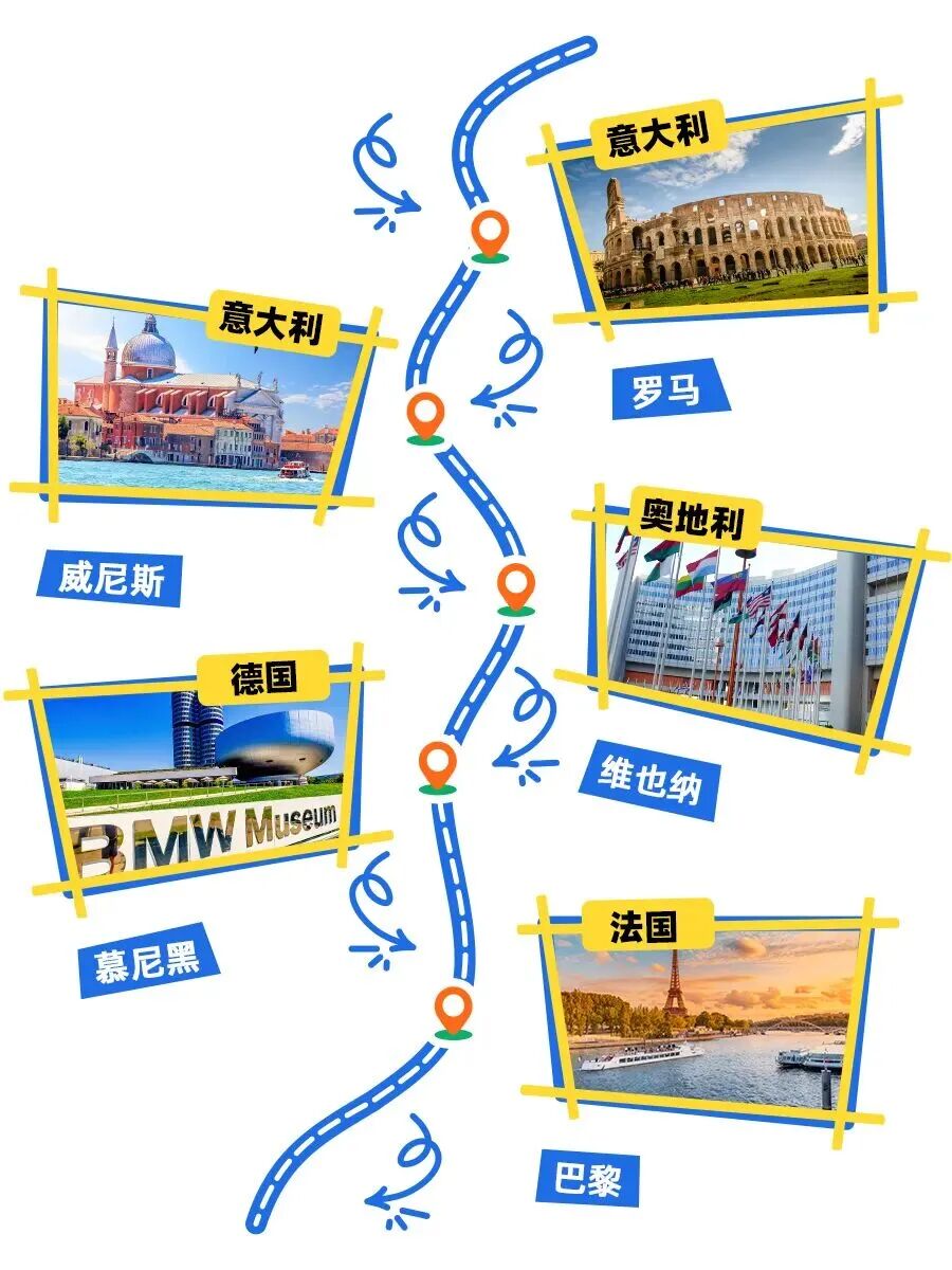 📍 欧洲线:法国(巴黎)、德国(慕尼黑)、意大利(罗马、威尼斯)、奥地利(维也纳)