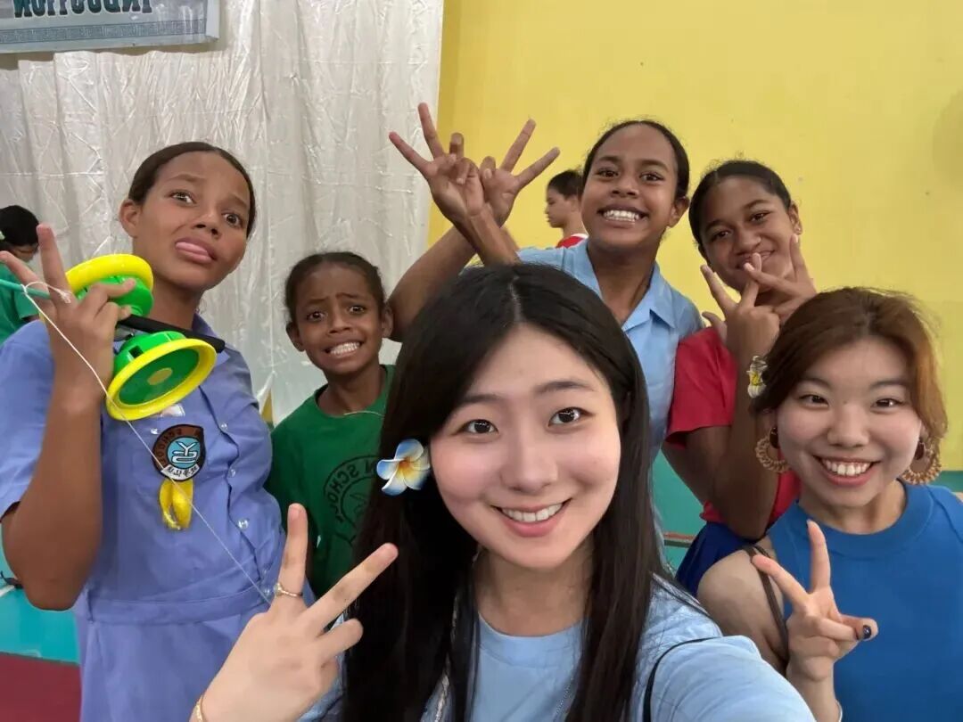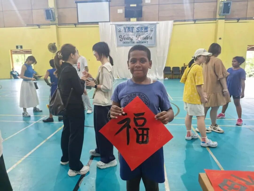 整个行程中,最让我印象深刻的是在斐济与当地孩子们的文化交流活动。在逸仙学校,我们带去了中国的传统非遗项目,比如教他们做风筝、写“福”字,教他们玩空竹。后来我们还坐在一起聊天,虽然英语说得不太流利,但大家都很努力地表达自己。我忽然意识到,文化传播不一定是站在台上平铺直叙、读读稿子,而是这种最简单的互动和直接交流,就能让人感受到彼此的善意和热情。这件事让我深深体会到,作为英语专业的学生,我的语言能力和表达真的可以成为一座桥,让我去连接不同国家的人,去传递我们中国的文化,去沟通我们的世界与生活。