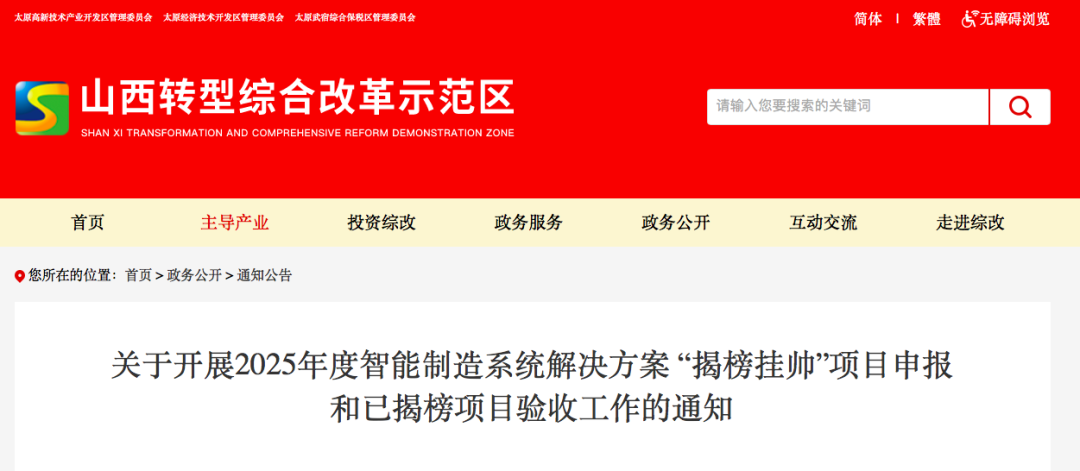 为加快制造业高端化、智能化、绿色化转型,打造智能制造“升级版”,山西省工业和信息化厅近日正式启动2025年度智能制造系统解决方案“揭榜挂帅”项目申报工作,同步推进已揭榜项目验收,面向全省优质创新力量征集智能制造关键难题解决方案,为山西工业“智”变注入新动能 。
