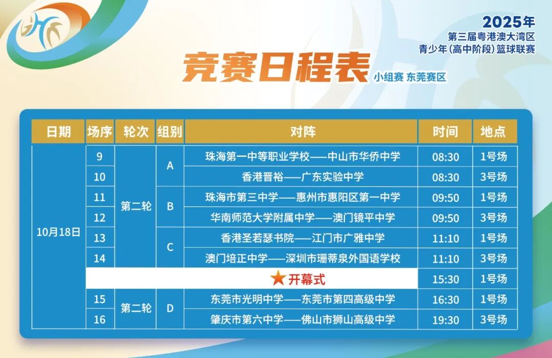 10月17日19:00,2025年第三届粤港澳大湾区青少年(高中阶段)篮球联赛小组赛东莞四中赛区正式打响,共有12支队伍进行6场比赛。