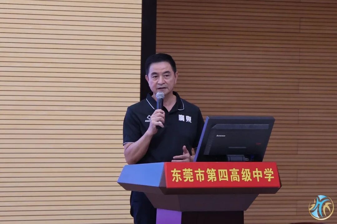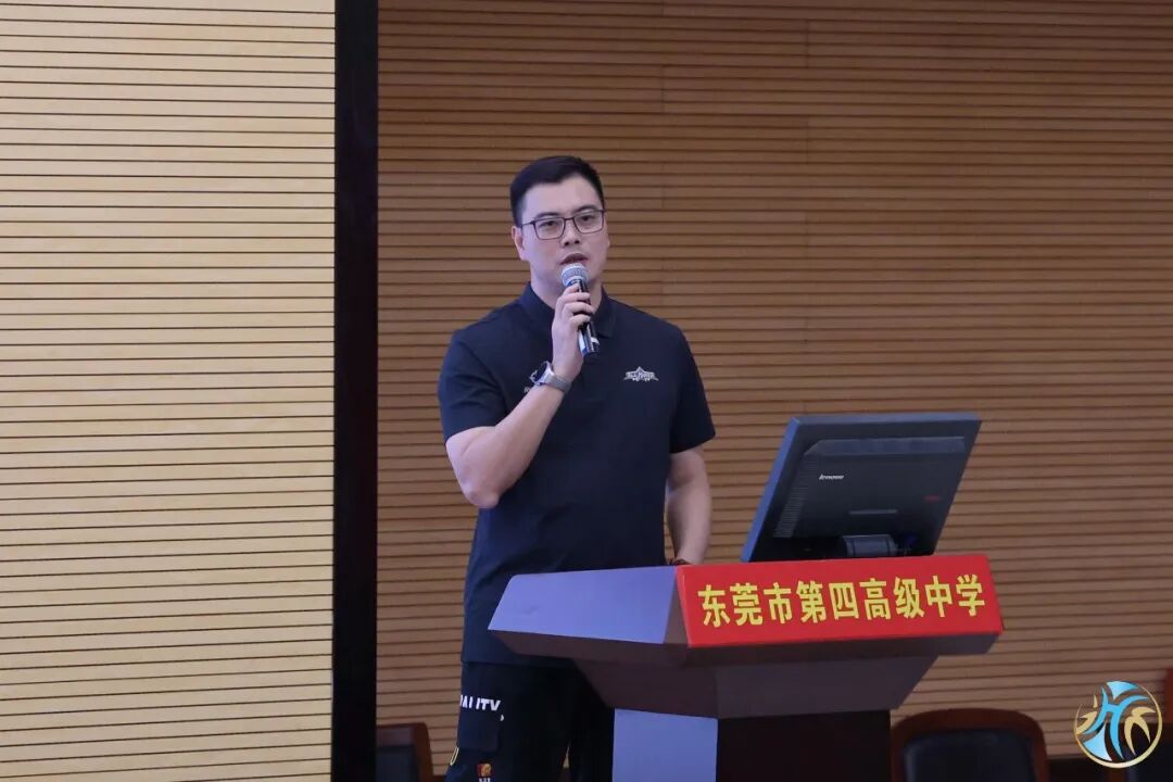 东莞市第四高级中学校长蔡俊宁致欢迎辞,他表示,东莞四中很荣幸成为本届联赛小组赛举办地,将以热情严谨的态度为赛事提供保障。作为全国篮球特色学校,东莞四中也期待以此次联赛为契机,与大湾区各兄弟学校携手探索青少年篮球人才培养的新路径、新模式,为广大学生搭建切磋球技的平台,共同促进湾区青少年体育事业协同发展。