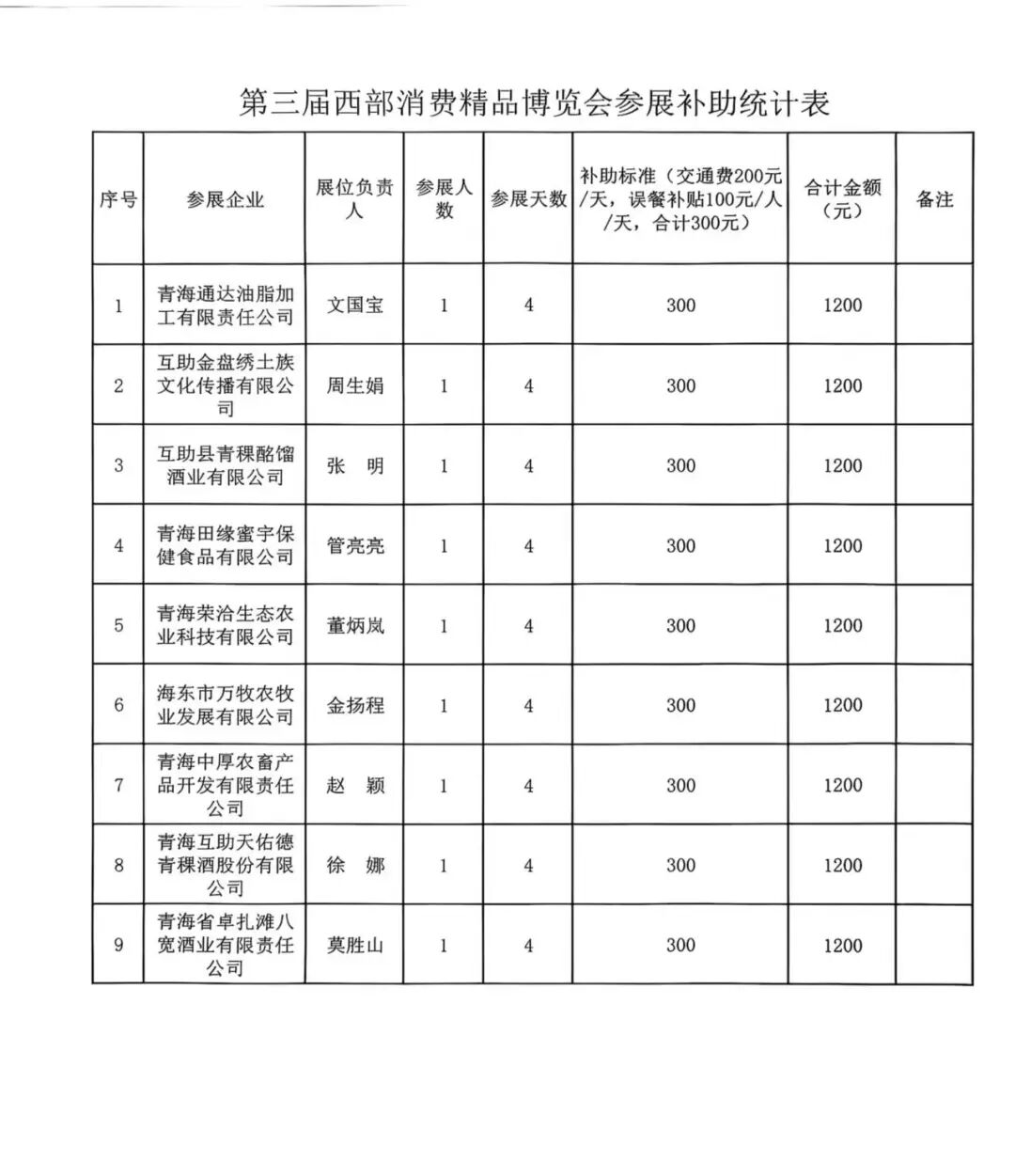 根据省市商务部门通知,我局组织9家商贸流通企业前往陕西省西安市参加第三届西部消费精品博览会,9大类100余种农特产品在西博会展示销售,根据《2025年互助县商贸流通企业展会补贴实施方案》,经局党组会审议通过,我局计划向通达油脂、互助金盘绣等9家企业发放展会补贴10800元(大写:壹万零捌佰元整,交通补贴200元/天,误餐补贴100元/天),现将具体补助金额予以公示,公示期为5天(2025年10月29日至2025年11月2日),若有异议,请在公示期内反映。