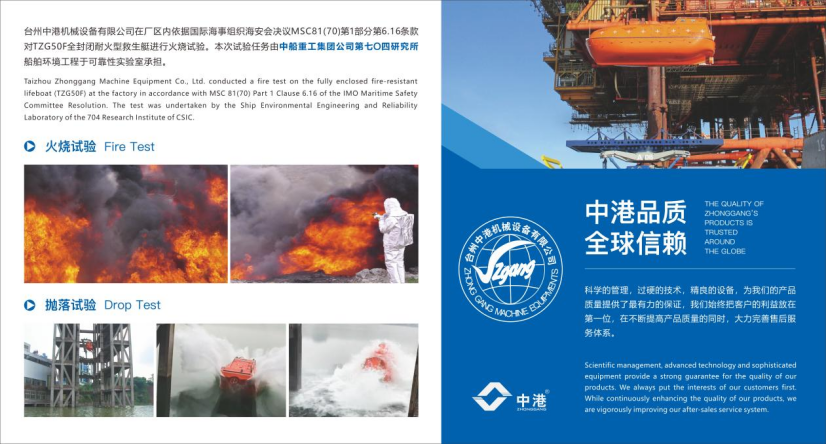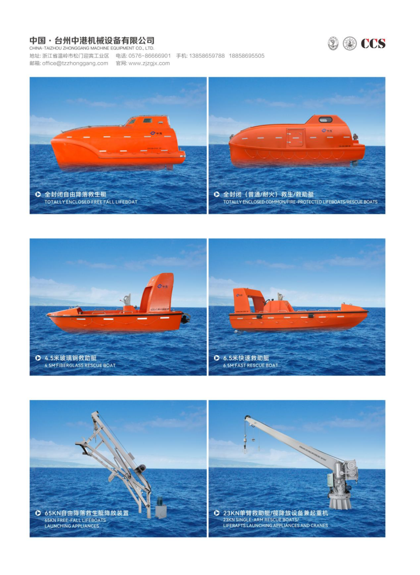 Located in a coastal city of East Zhejiang, Taizhou Zhonggang Machine Equipment Co., Ltd. is a company that integrates professional R&D, manufacturing and sales of life-saving equipment and GFRP (glass fiber reinforced plastic) lifeboats. It is currently one of the top well-known manufacturing enterprises in the province, with production testing facilities that are advanced both at home and abroad. Our products are well sold domestically and internationally and have won the praise and trust of our customers.