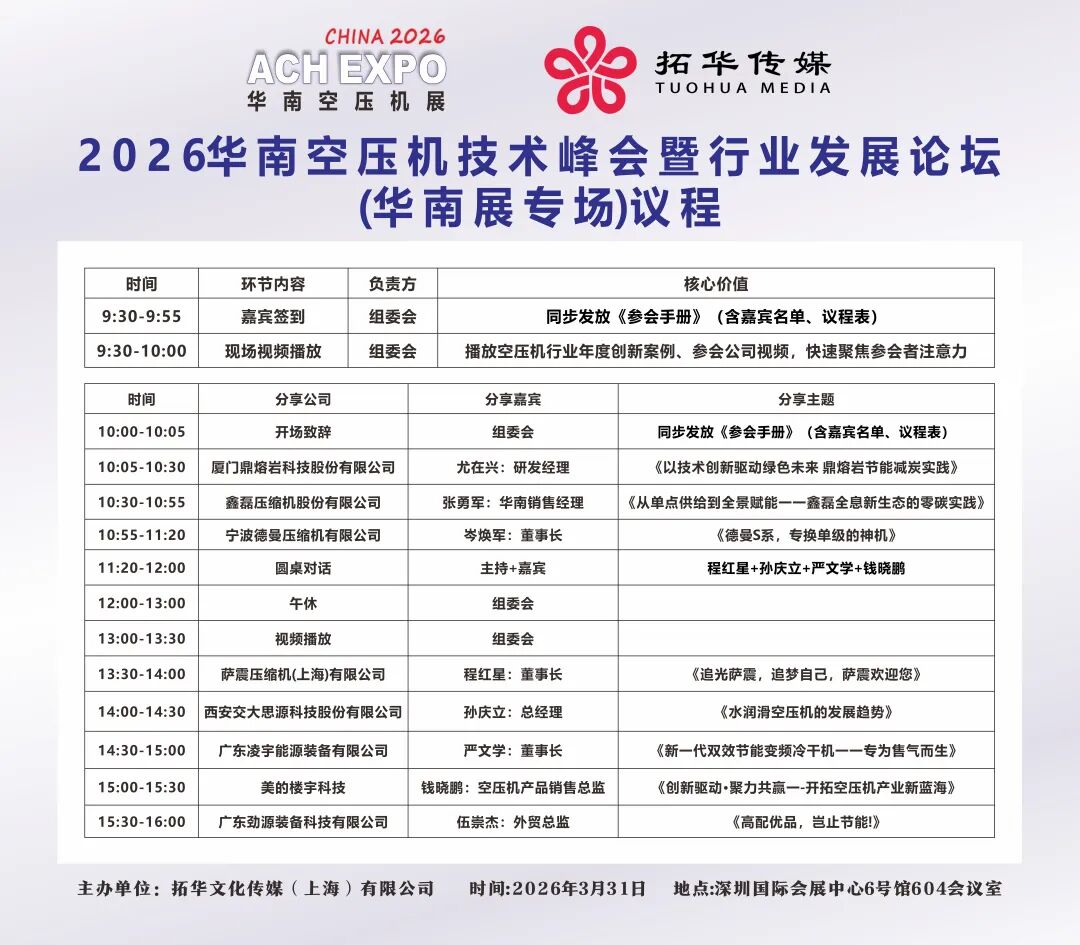 粤港澳大湾区产业升级加速,节能、智能、高效成为空压行业新赛道。为凝聚行业力量、共享技术红利、共拓华南市场、拓华特主办《聚势华南·智领空压--2026华南空压机技术峰会暨行业发展论坛》