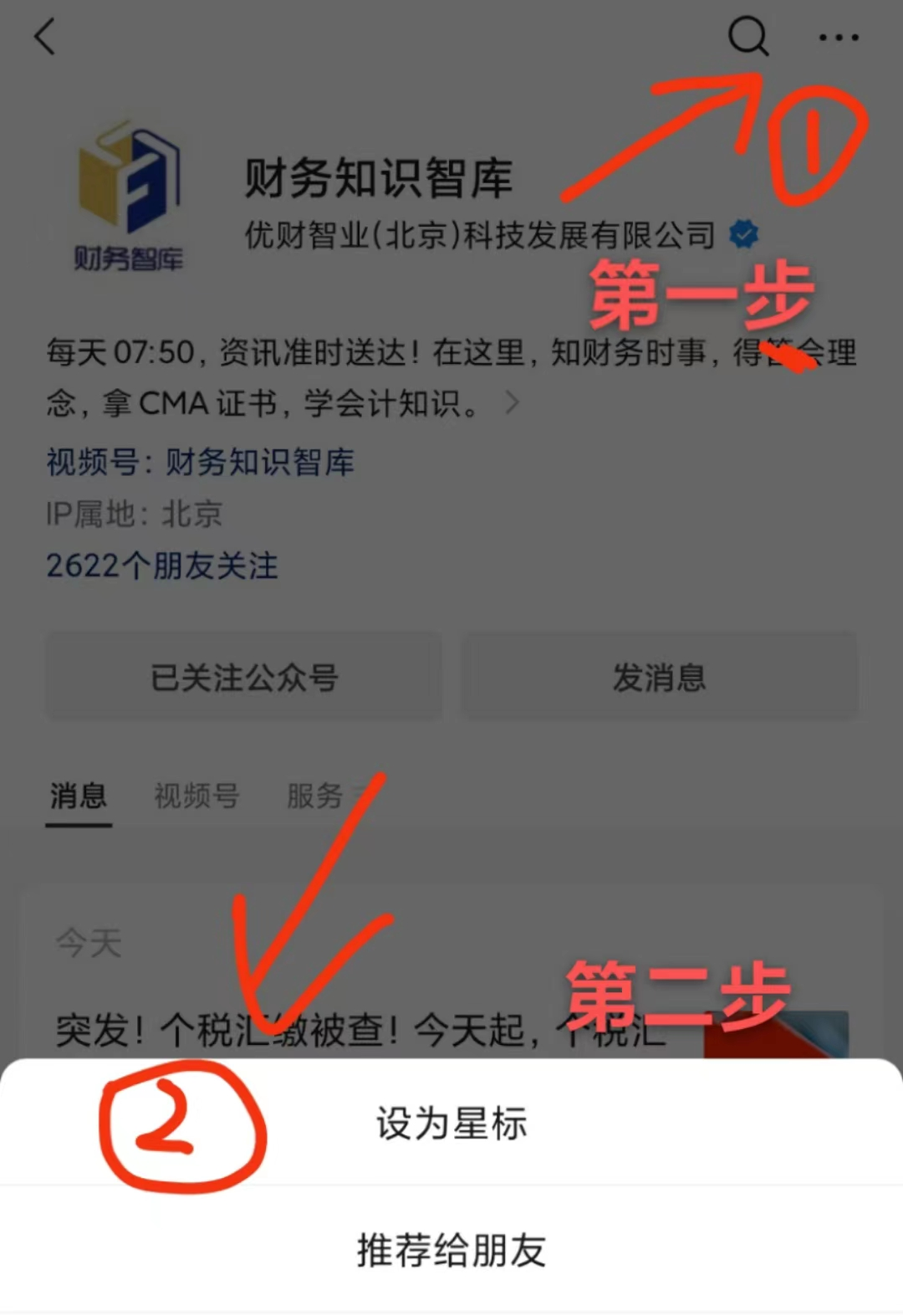 最近公众号改版,及时接收到文章推送需要给公众号加星。大家可以点击页面上方蓝色字【财务知识智库】进入如下页面,第一步:右上角...;跳出下图后点击第二步:设为星标,愿大家阅读愉快!
