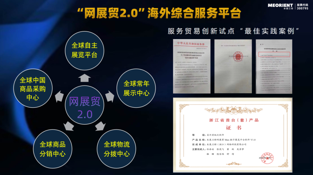 “网展贸2.0”海外综合服务平台是米奥兰特在国家政策强力支持下打造的国家级外贸创新项目。其前身可追溯至2020年国务院服务贸易发展部际联席会议办公室发布的首批“深化服务贸易创新发展试点最佳实践案例”——米奥兰特创新“网展贸”服务新模式。