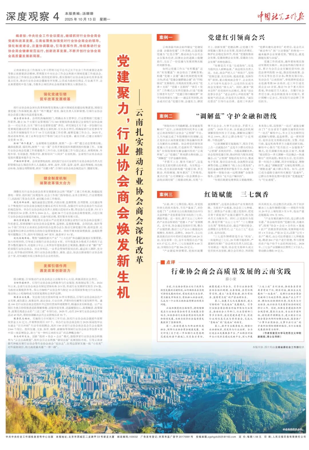 编者按:中央社会工作会议提出,继续抓好行业协会商会党建和改革发展。云南省聚焦加强党对行业协会商会的领导,强化制度建设,注重协调联动,引导发挥作用,持续推动行业协会商会健康规范运行、创新改革发展,不断开创行业协会商会高质量发展新局面。