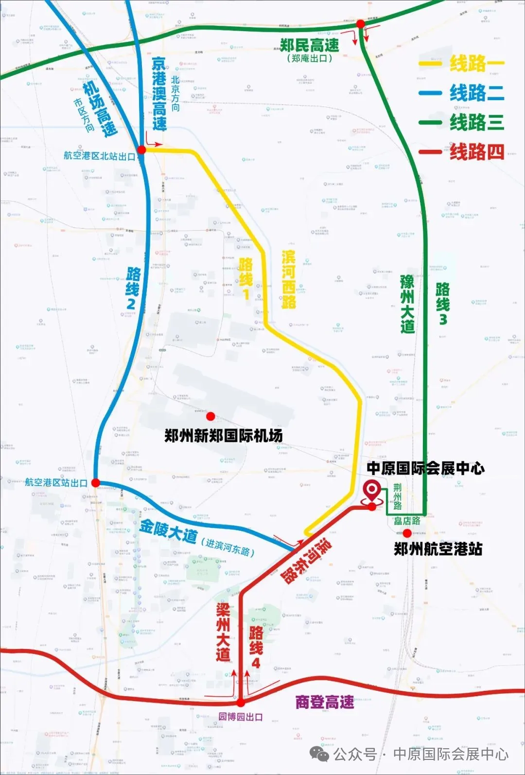 路线一(推荐)从郑州市区出发→经S1机场高速(或G4京港澳高速)→航空港区北收费站→滨河西路→亳都路→滨河东路→中原国际会展中心P2停车场
