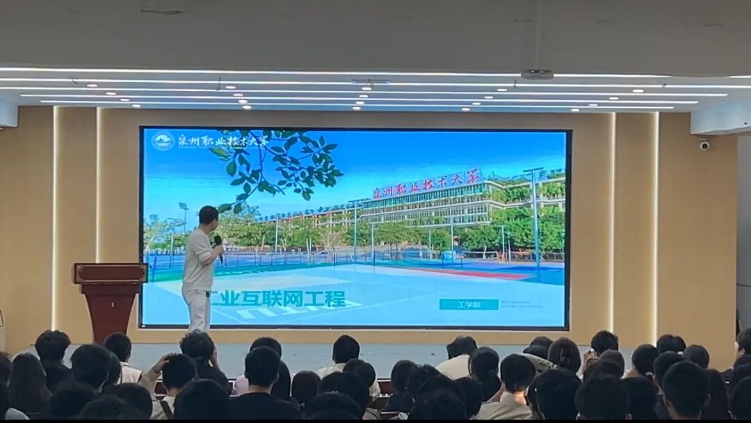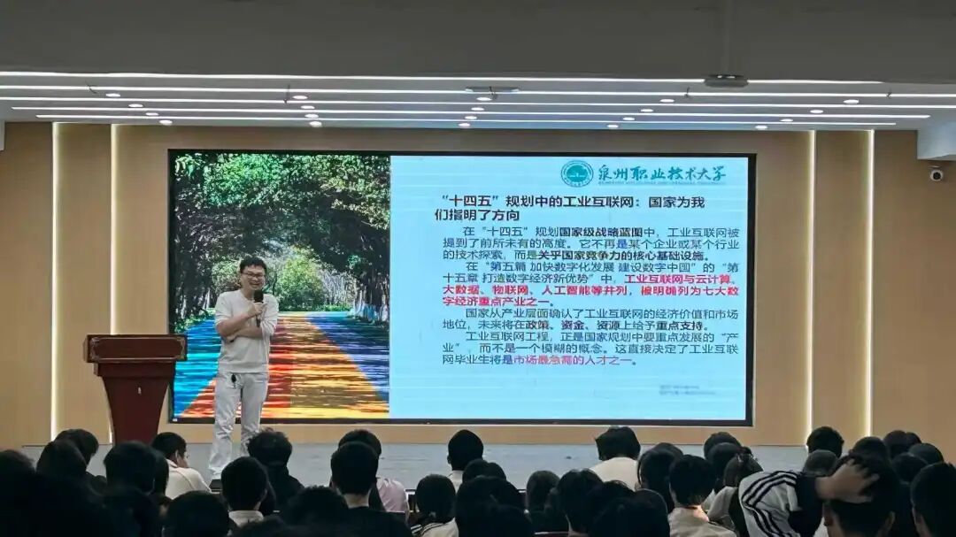苏昭晖老师以“工业互联网:给工厂装上神经网络”为题,生动解读了IT、CT、OT技术的融合路径。他结合“316原则”(30%平台资源、10%机会、60%态度)强调“踏实决定下限,态度决定上限”,并指出工业互联网工程是“国家数字经济重点产业”,毕业生将成为“系统实施与集成工程师”的中坚力量。