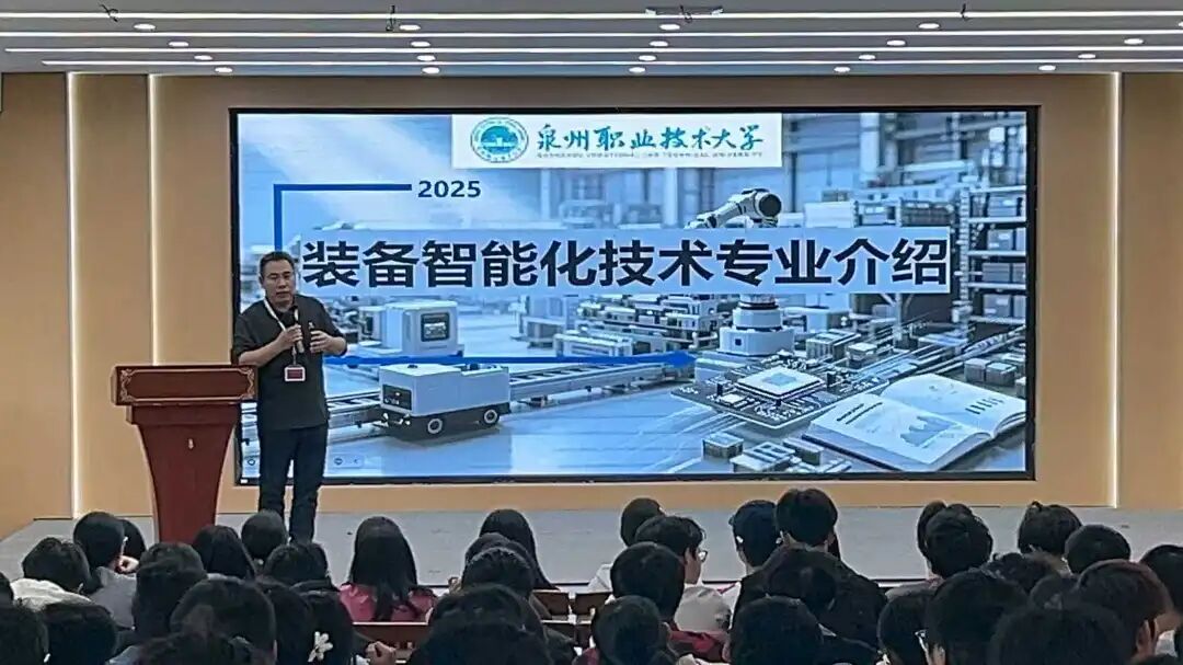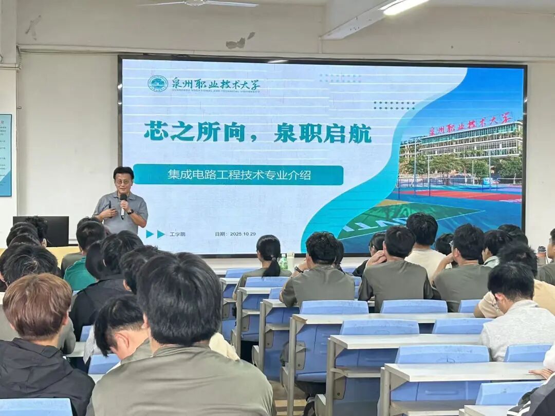 詹启明教授以“芯之所向,泉职启航”为主题,系统介绍了集成电路在“国之重器”中的战略地位。他从半导体材料、芯片制造流程,到封装测试技术,层层剖析,并结合福建省“一带双核多园”的产业布局,指出集成电路是“未来十年最具潜力的赛道之一”。他鼓励新生“沉下心来学技术,静下心来谋未来”。