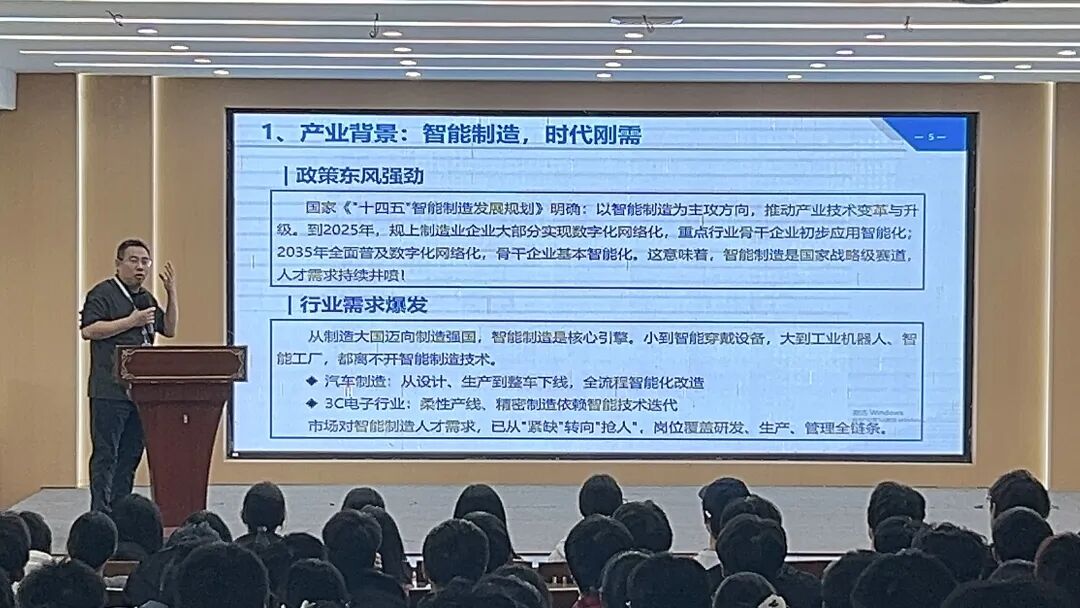 蔡海毅老师以“选对专业,站在时代风口”为切入点,指出装备智能化是智能制造的核心支撑。他通过小米汽车工厂、智能产线等案例,展示了专业在“研发—制造—运维”全链条中的岗位需求,强调“高端技术人才是企业最急需的资源”,鼓励学生成为“能设计、能改造、能运维”的复合型人才。