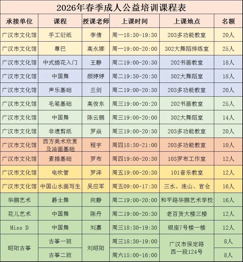 广汉市文化馆2026年春季成人公益培训将于2026年4月7日--2026年5月29日举办。本季培训开设:舞蹈、声乐、器乐、美术等课程,共17个班,预计招收学员240余人。