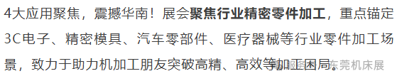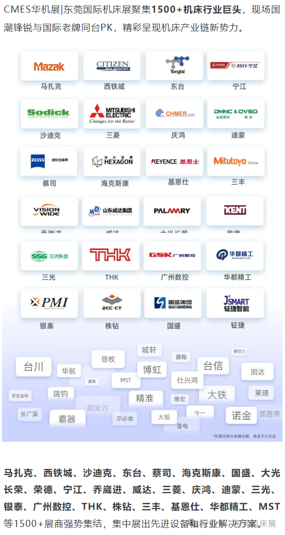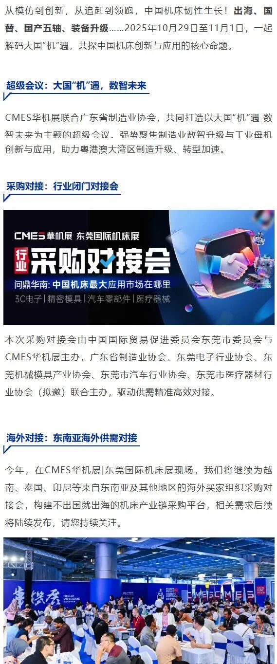 CMES华机展 | 东莞国际机床展精准锚定 3C 电子、精密模具等核心行业加工痛点,以专业的展品矩阵搭建起 “需求与方案” 的桥梁。10月29日至11月1日,东莞厚街广东现代国际展览中心,我们热切期盼与各位行业同仁相聚,在实地考察、深度交流中发掘新机遇、碰撞新思路,让每一次驻足都成为推动事业向前的力量,共赴这场属于机床人的专业盛会!