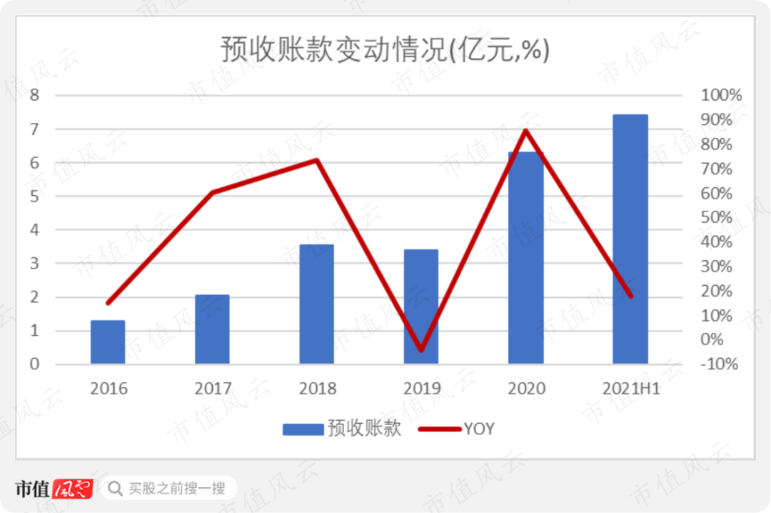 而2020年6月末,海天精工预收账款(即:合同负债)为7.41亿元,较期初增长17.9%。