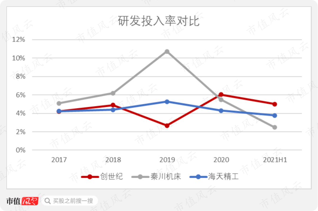 研发投入方面,与创世纪、秦川机床相比,海天精工相对更稳定。