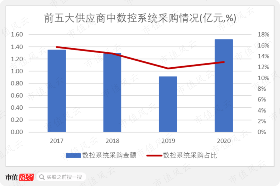 2017年~2020年,海天精工披露的前五大供应商采购情况中,每年数控系统的采购金额占当年采购总额的比重都在10%以上。