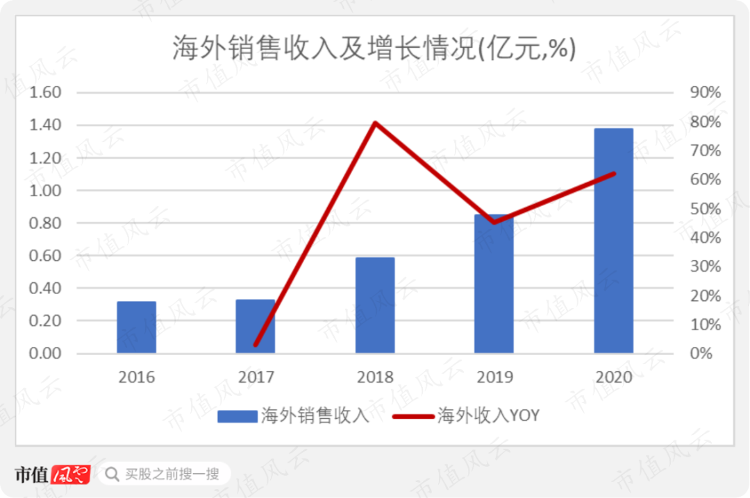 2016年,海天精工的海外销售收入只有3,152.6万元。但到了2020年,其海外销售收入增长至1.37亿元。2018年~2020年,海外收入的年增幅已连续三年保持在45%及以上。