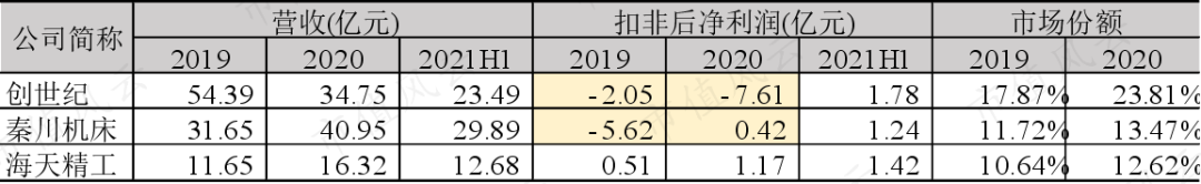 尽管国内数控机床行业CR5的市场份额,从57.6%(2019)进一步提高到64.7%(2020),但就净利润情况而言,排在第一和第二的创世纪与秦川机床(000837.SZ)的盈利水平都难言优秀,秦川机床更是在今年5月才刚刚摘帽。