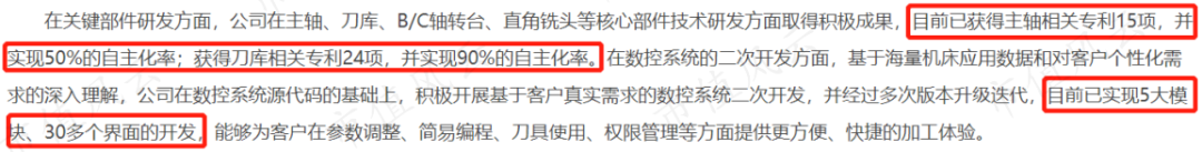 创世纪在主轴和刀库上已分别取得15项、24项专利,并分别实现50%和90%的自主化率。同时,创世纪在数控系统的二次开发上也已取得一定成效,能够进一步提高产品的附加值。